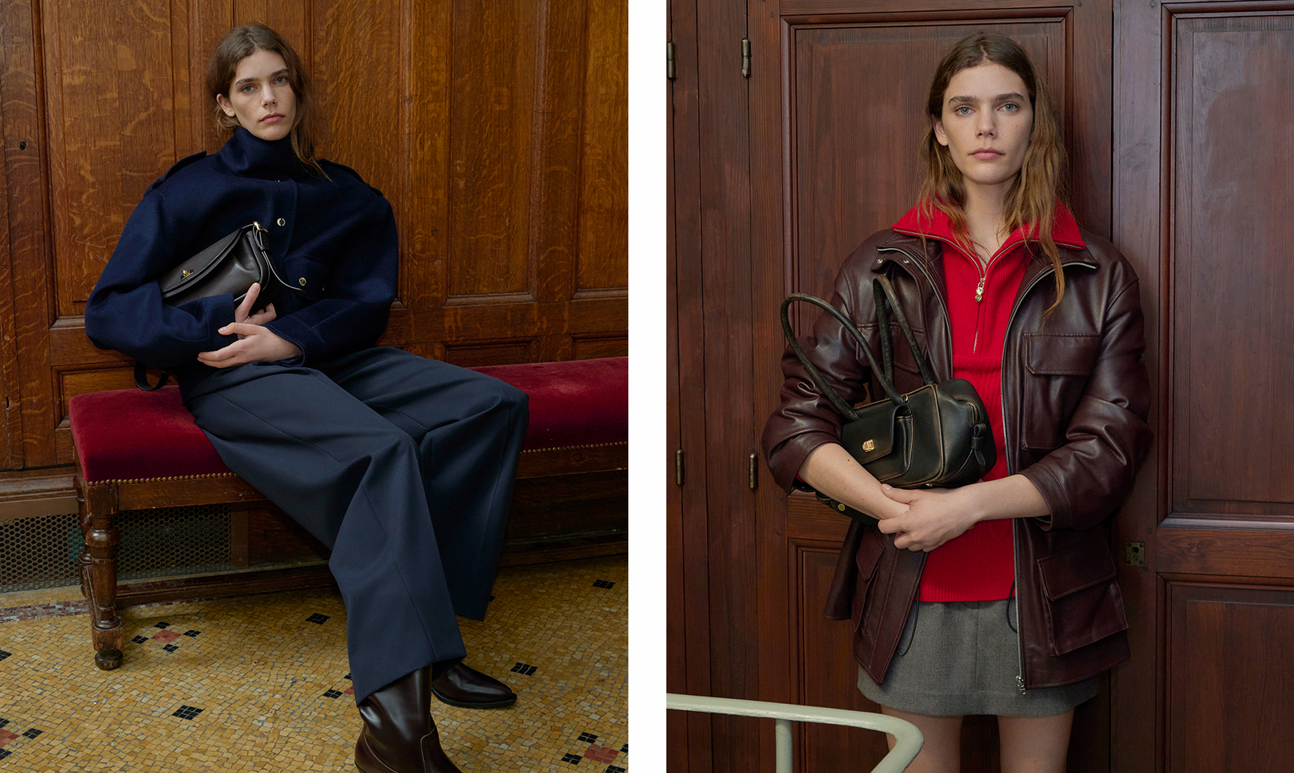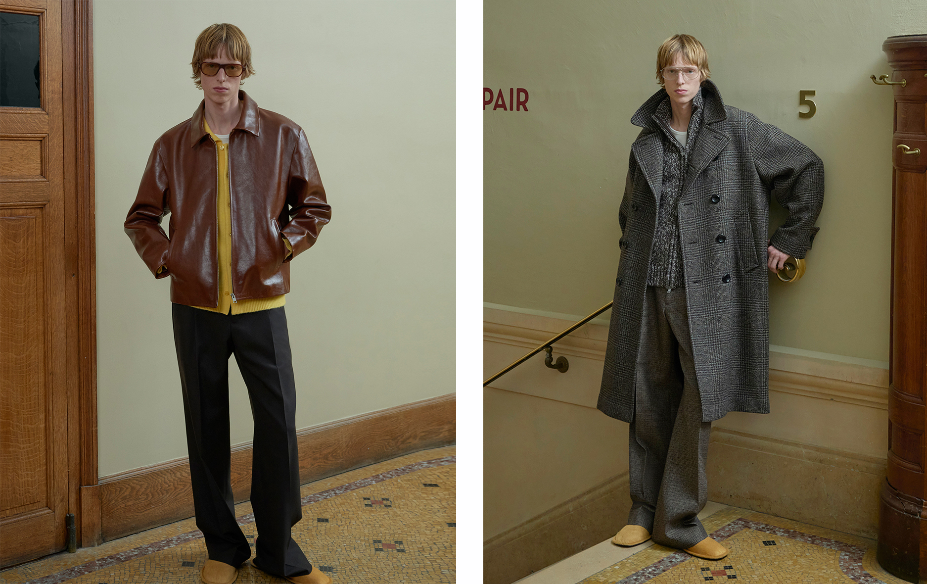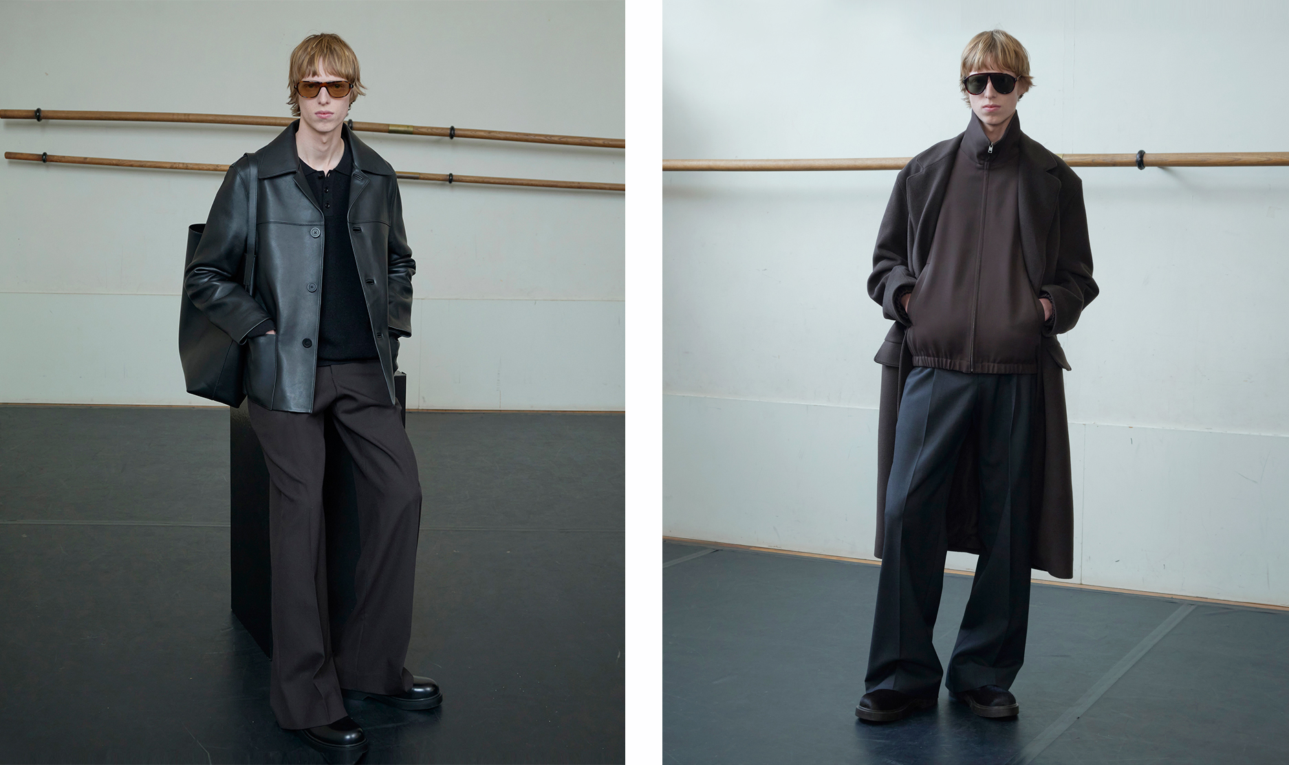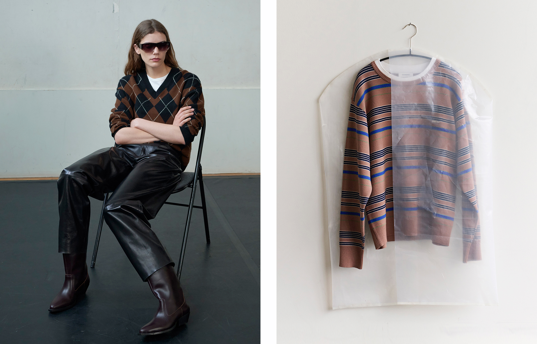 色调深邃而细腻:黑、拿铁、巧克力、海军蓝、烟草棕、深灰, 混纺面料交叠,营造精致质感。色彩仅在重点单品中出现 — 如焦糖或绿松石色的 Oversized 皮革外套,搭配亮色马海毛针织, 冬季材质展现丰富层次:双面羊毛、喀什米尔、包覆感的羊驼毛、旧化皮革,以及近似氯丁橡胶的质感, 设计语言极简、当代、奢华,流动与结构彼此对话。配件完整勾勒轮廓:厚实的巧克力色德比鞋与短靴、稻草色拖鞋,以及带有 70 年代风格再诠释的几何眼镜。 本季勾勒出一种克制而内省的男性气质——一个能自信迎接冬季的衣橱,在精准与自在、精致与节制之间取得平衡,忠实呈现 SANDRO 男装的摩登视野。