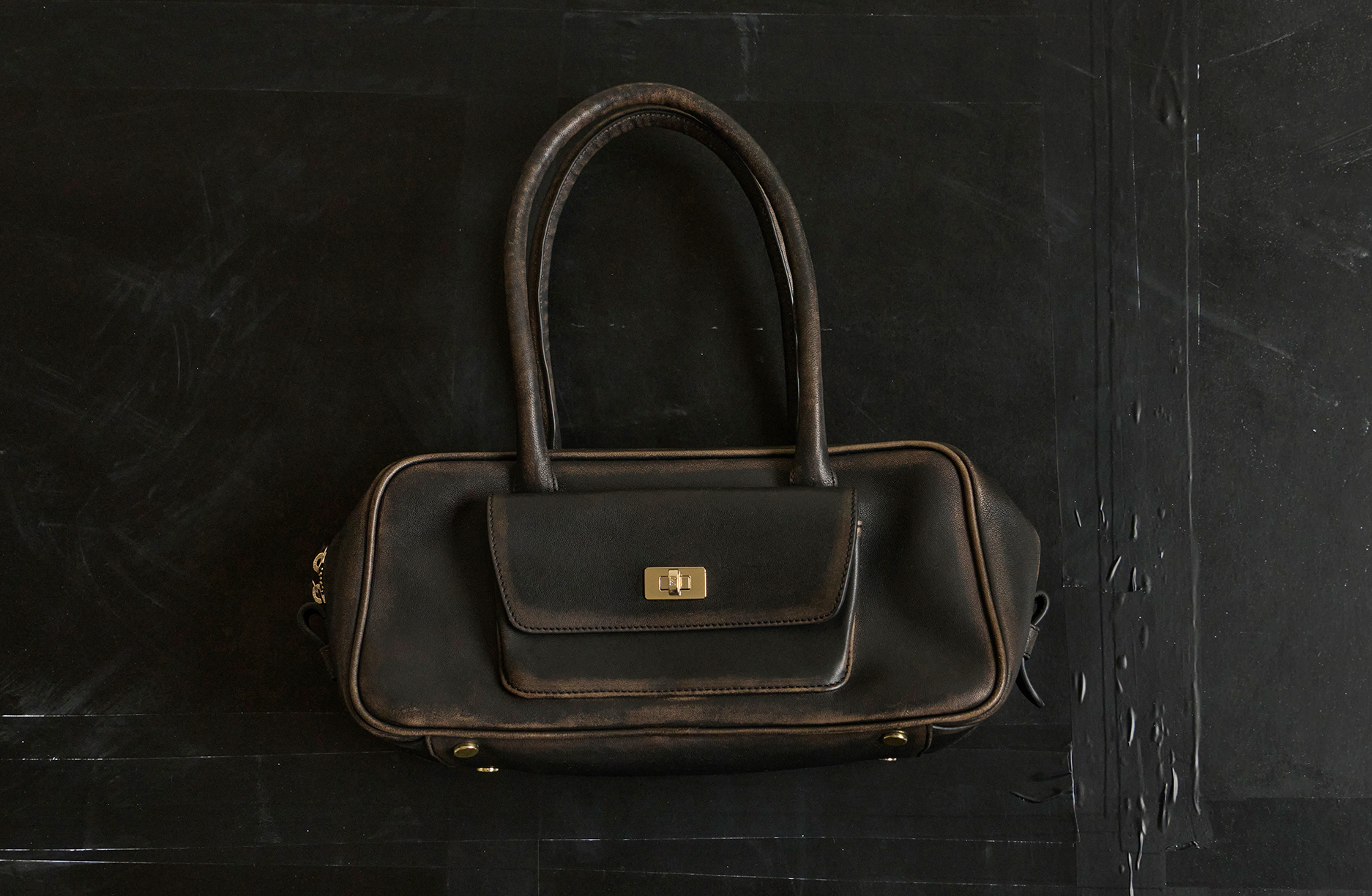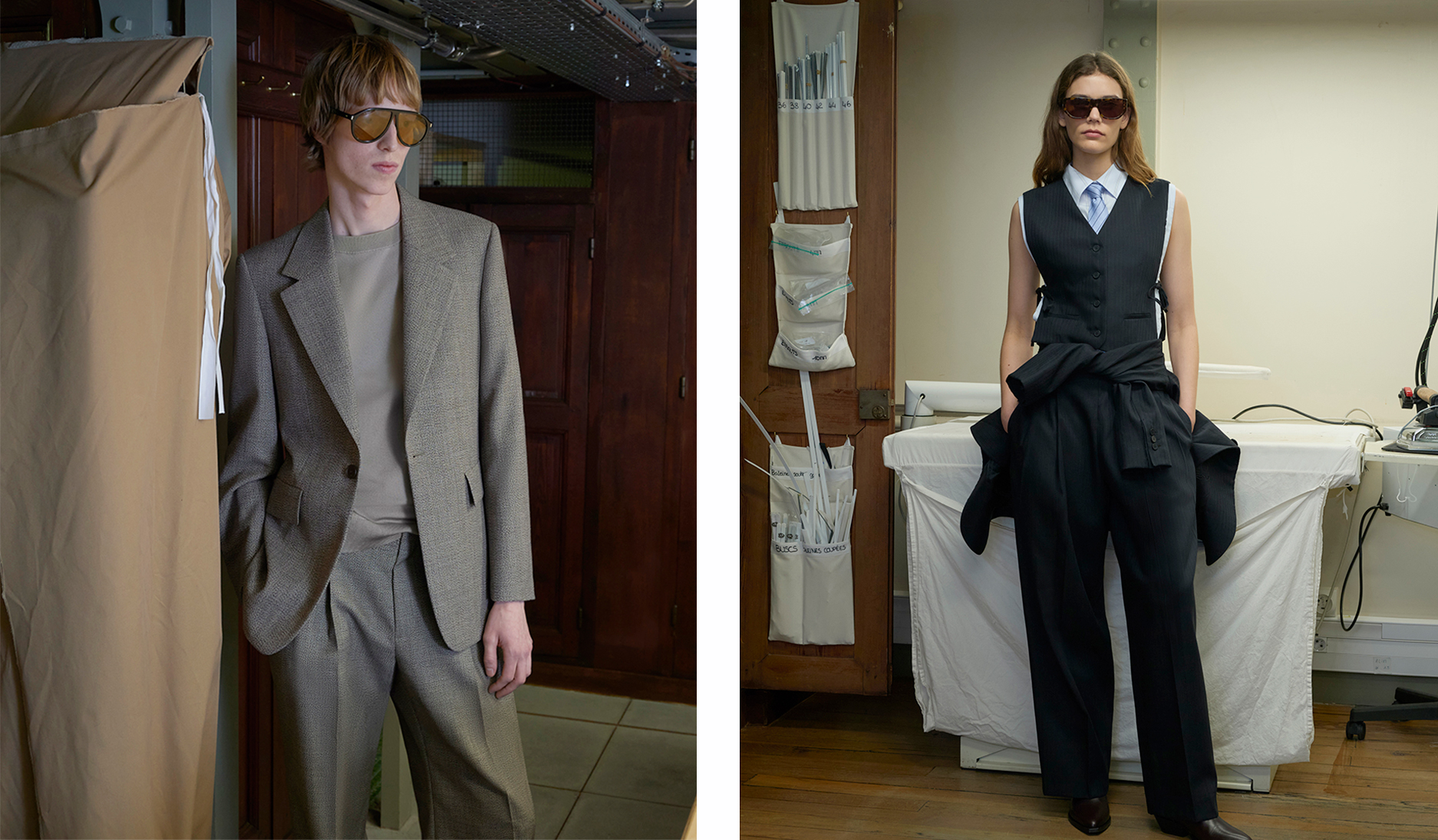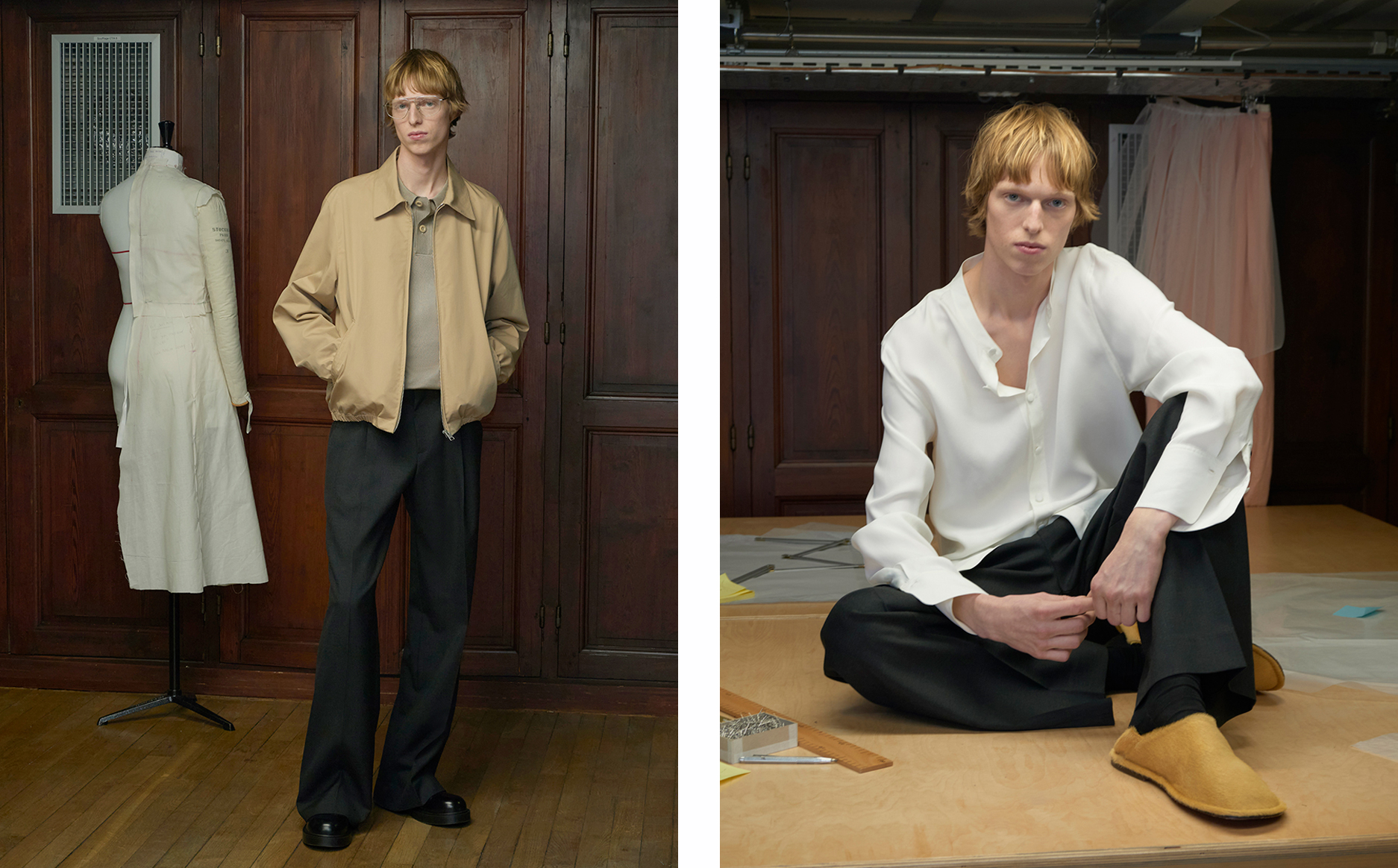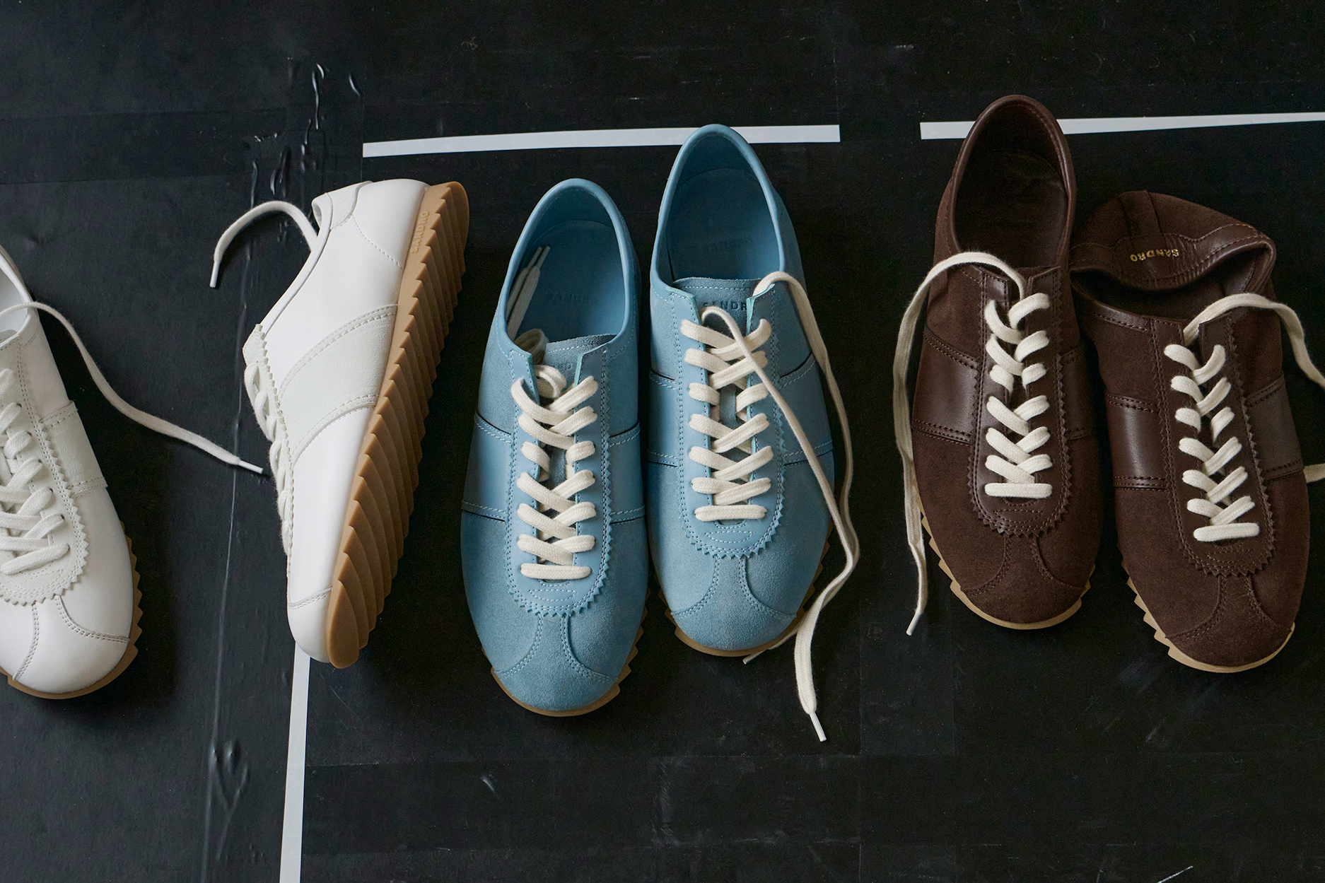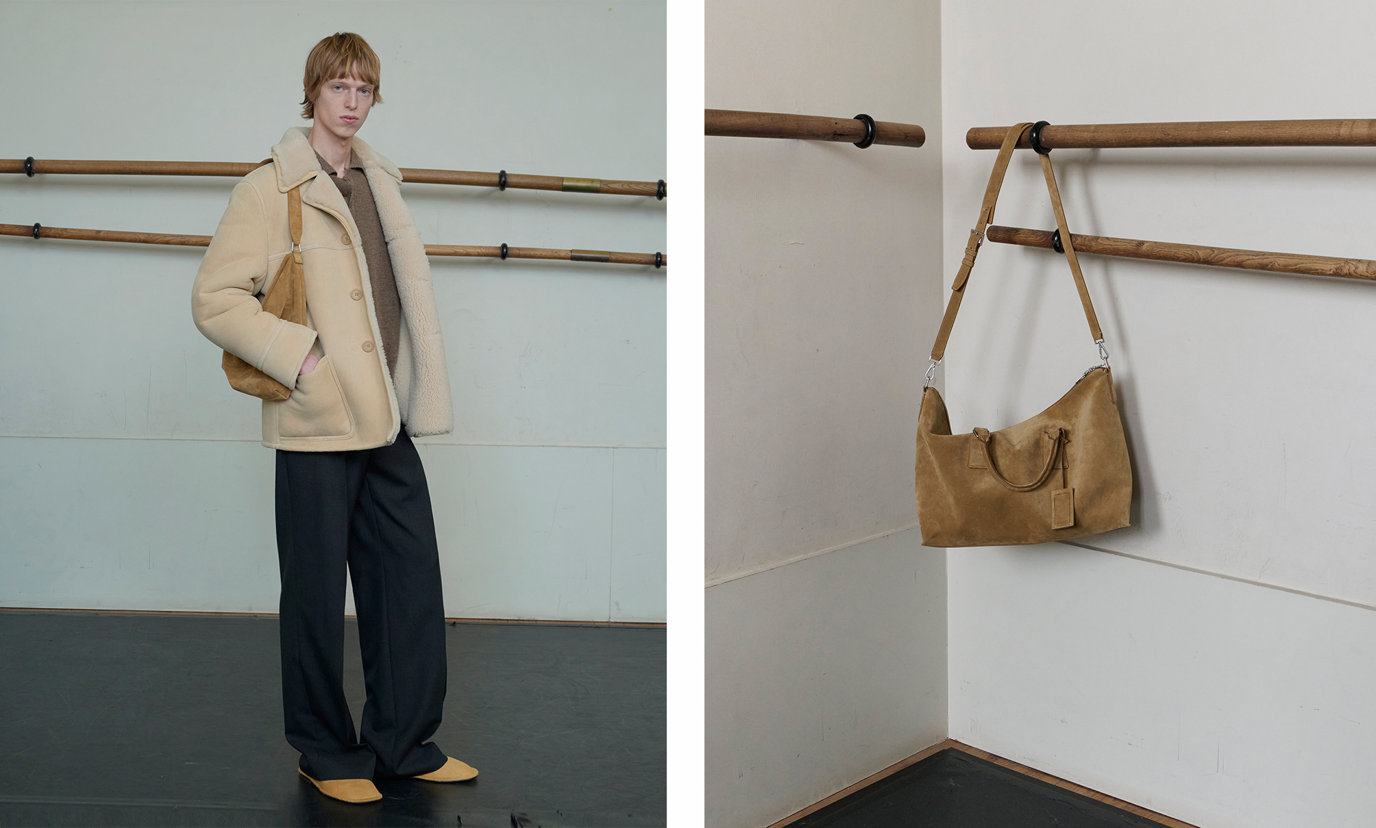 色调深邃而细腻:黑、拿铁、巧克力、海军蓝、烟草棕、深灰, 混纺面料交叠,营造精致质感。色彩仅在重点单品中出现 — 如焦糖或绿松石色的 Oversized 皮革外套,搭配亮色马海毛针织, 冬季材质展现丰富层次:双面羊毛、喀什米尔、包覆感的羊驼毛、旧化皮革,以及近似氯丁橡胶的质感, 设计语言极简、当代、奢华,流动与结构彼此对话。配件完整勾勒轮廓:厚实的巧克力色德比鞋与短靴、稻草色拖鞋,以及带有 70 年代风格再诠释的几何眼镜。 本季勾勒出一种克制而内省的男性气质——一个能自信迎接冬季的衣橱,在精准与自在、精致与节制之间取得平衡,忠实呈现 SANDRO 男装的摩登视野。
