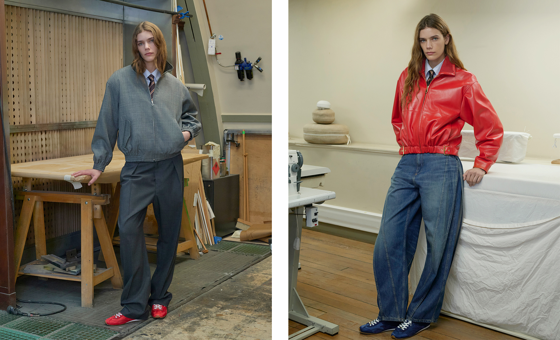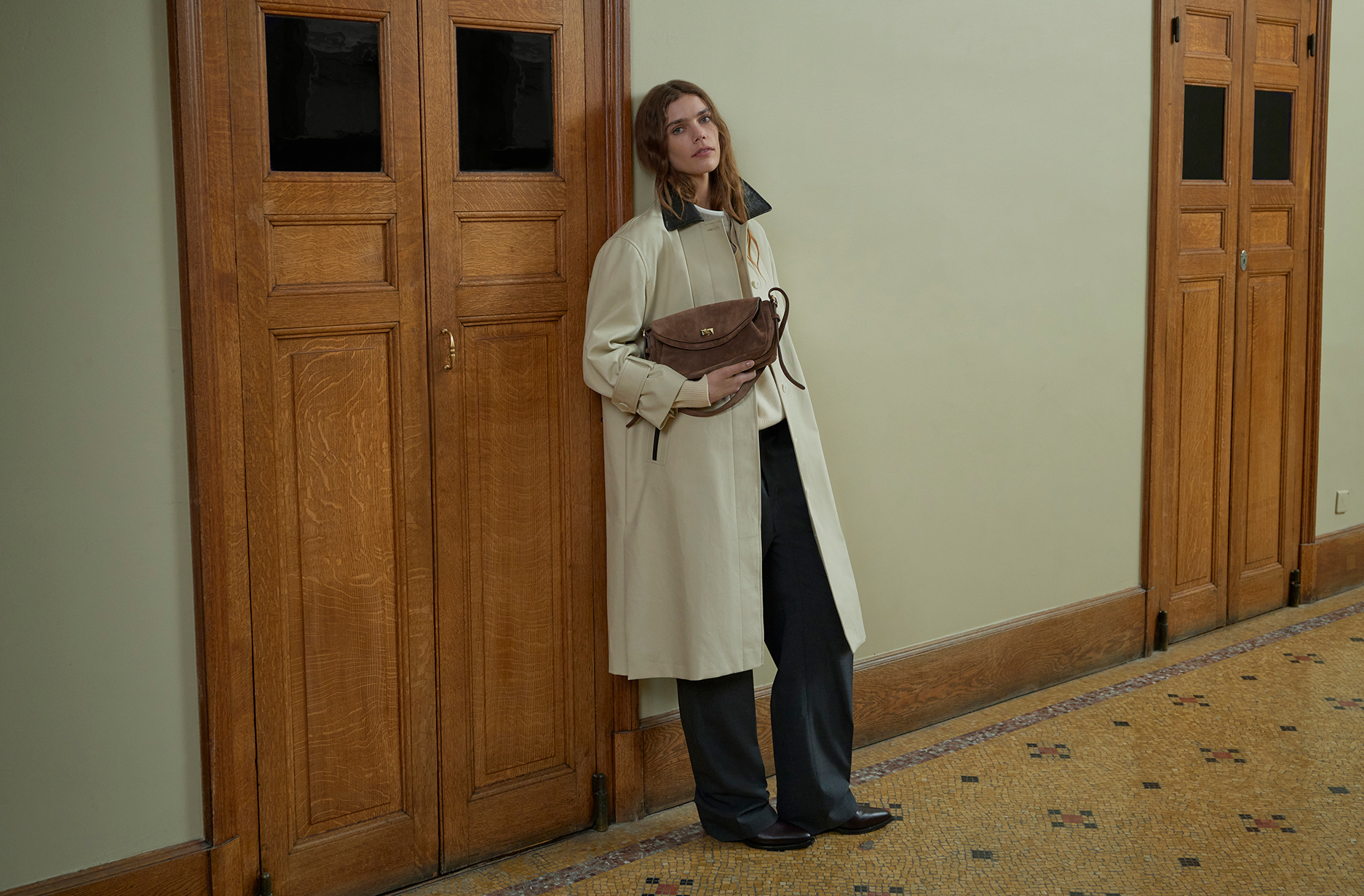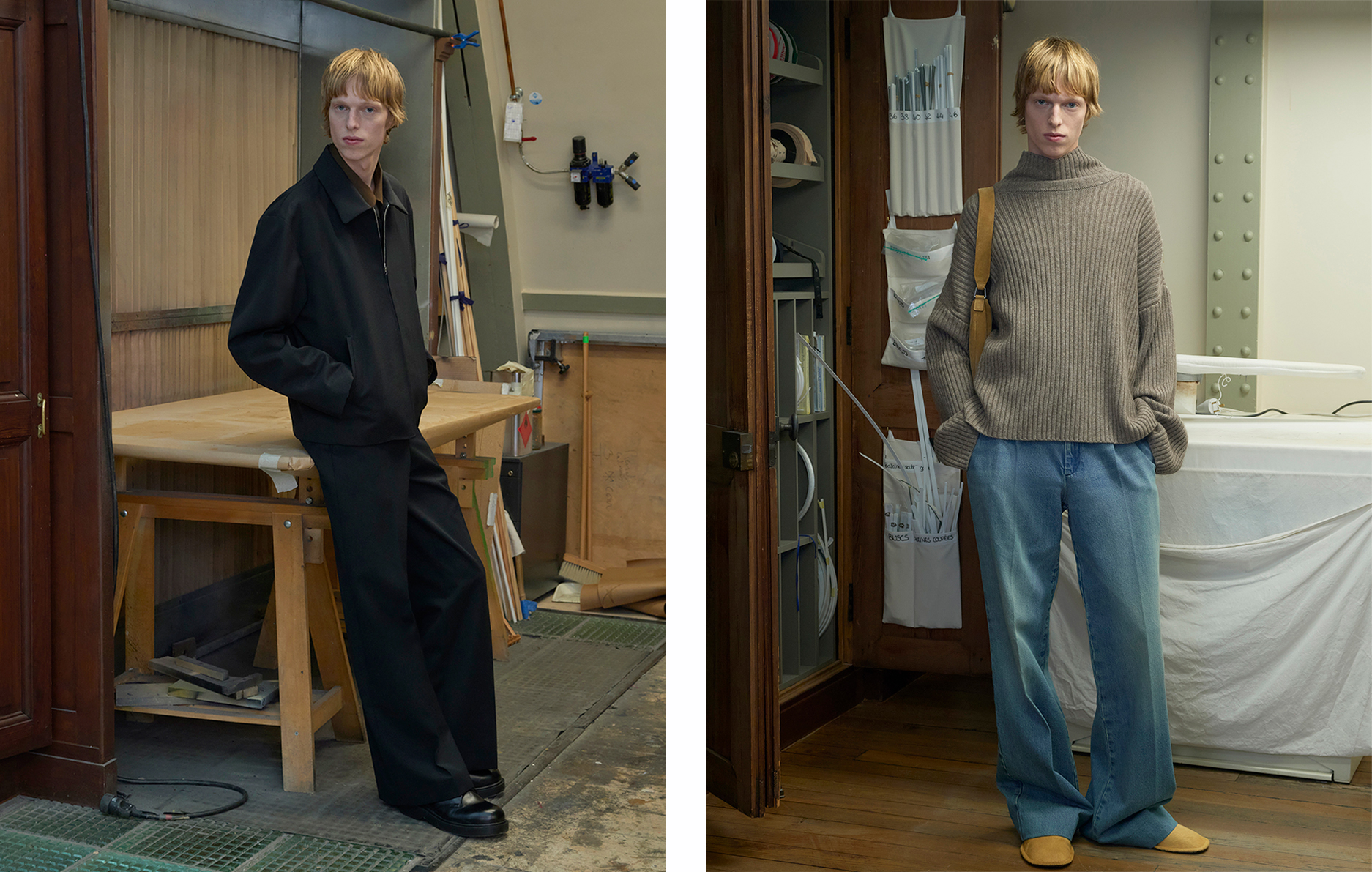 而 SANDRO 秋冬男装系列展现大胆而果断的摩登姿态。剪影充满都会气息,锐利如清晨寒意,优雅自然而然地流露当代精神,并融入非直白的复古影响。衣橱以层次构筑,始终保有自由感。宽松大衣包裹却不拘束,Car Coat 成为焦点单品,以黑色双面皮革或轻盈羊羔毛打造。双排扣、直筒剪裁、Mac 外套等轮廓柔韧而坚定。外套定义线条却不僵硬,刻意解构的手法摒弃垫肩与传统剪裁。羊毛西装外套、宽版牛仔外套领片、粗针罗纹针织,为造型增添节奏。长而宽的裤管自然覆鞋,强化慵懒不羁的姿态。