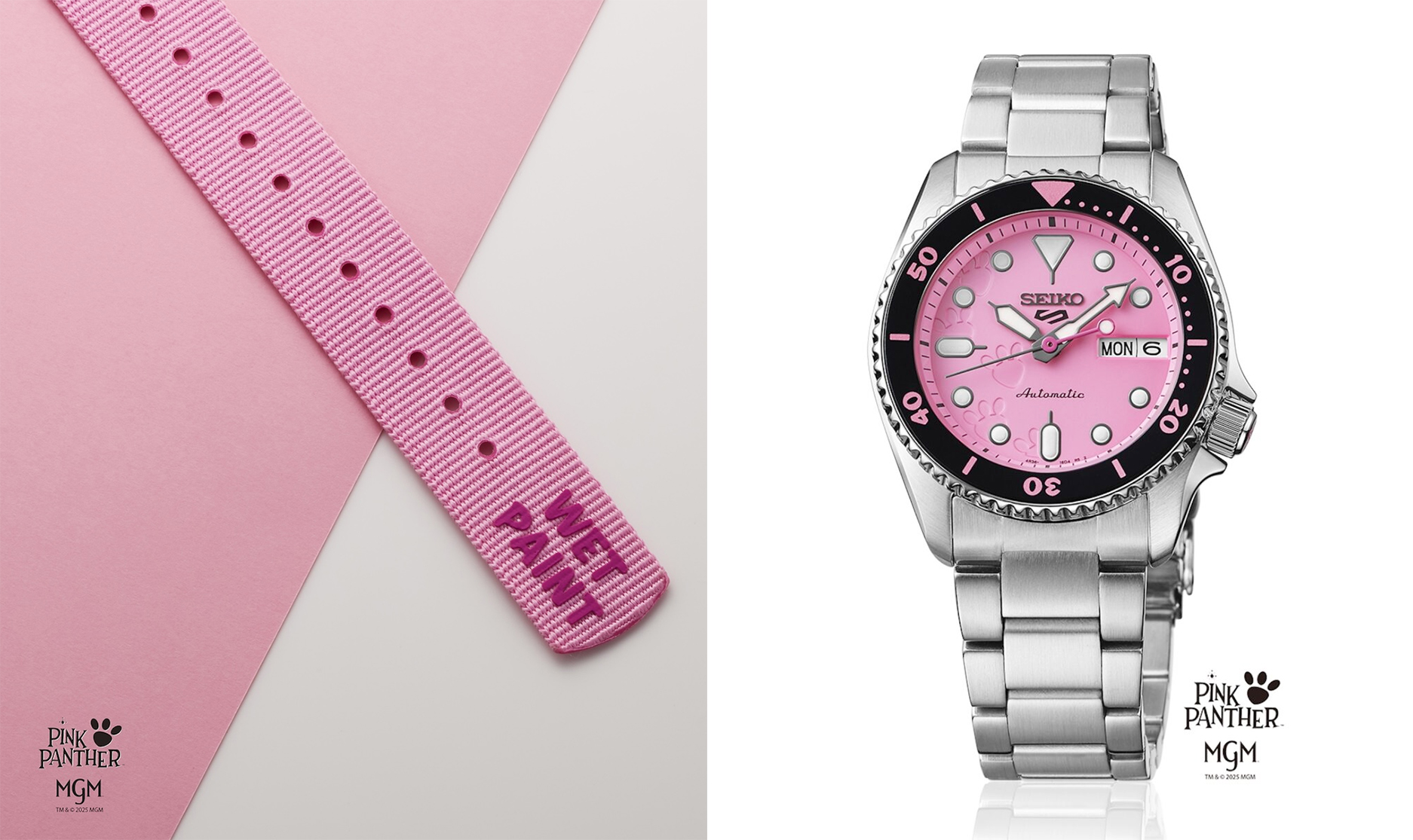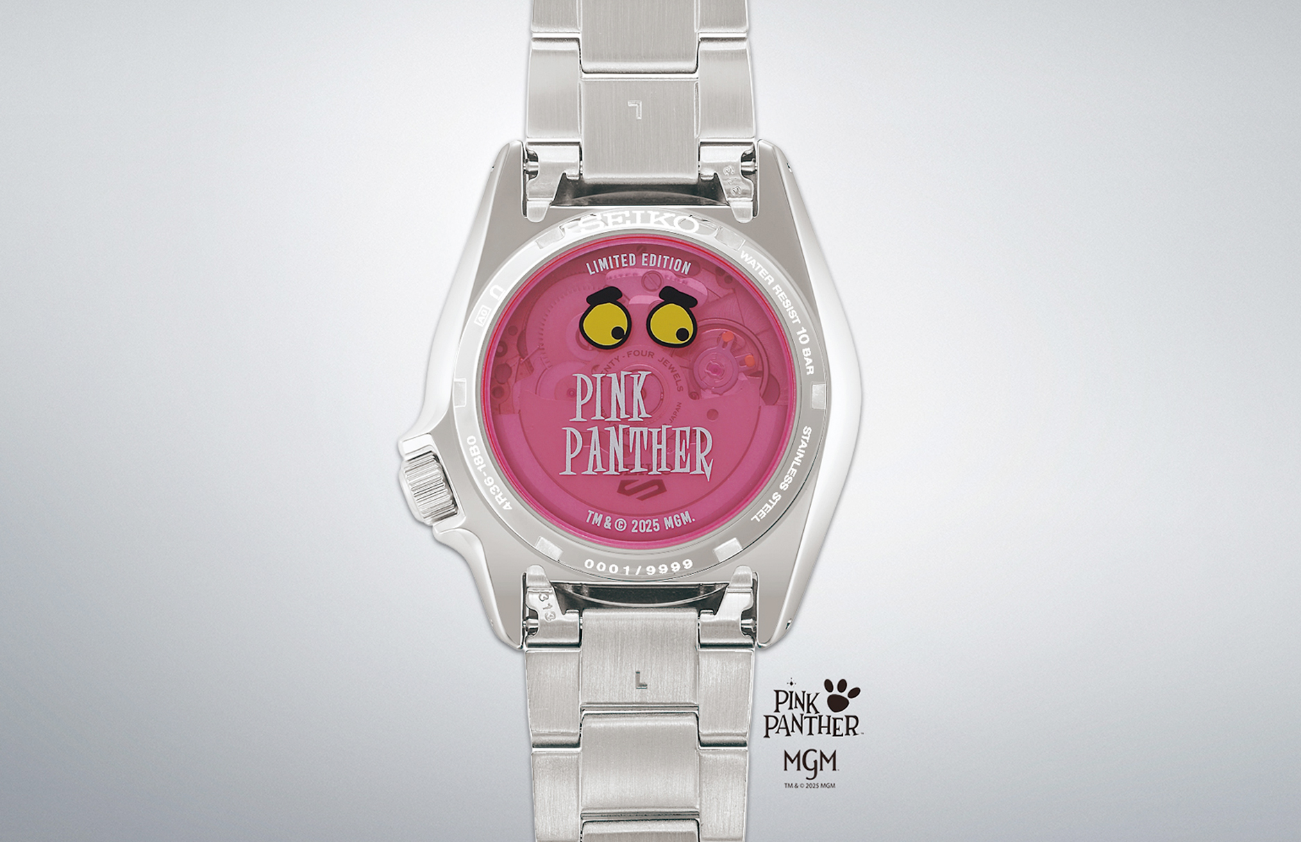 SEIKO 以经典 SEIKO 5 Sports SKX 为基础,推出限量联名腕錶,灵感来自动画《 The Pink Phink 》( 傻豹 )。 设计以傻豹将「 大鼻子先生 」房子涂成粉红色的桥段为核心,粉红錶盘、錶圈与秒针瞬间传达动画俏皮气息;錶盘并点缀傻豹足迹,呈现出趣味的视觉效果。