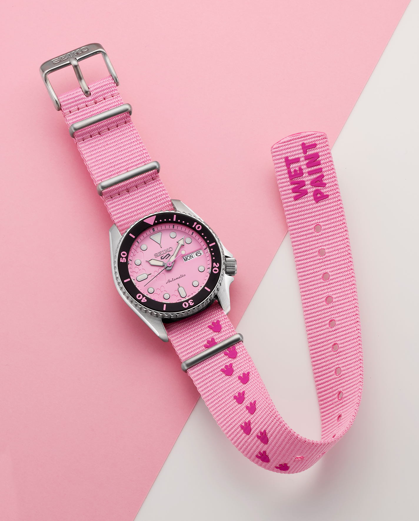 腕表内搭 SEIKO 4R36 自动上鍊机芯,提供 41 小时动力贮存, 防水 10 气压。 除了不锈钢链带,随錶亦附送一条粉红色尼龙錶带,同样印有脚印图案,末端再加上「 WET PAINT 」字样,幽默感由头到尾一脉相承。 此款联名腕錶保留了 SEIKO 5 Sports SKX 系列耐用与实用特性的同时,巧妙融入复古动画符码,既适合日常佩戴,也具收藏意义。 限量 9,999 枚,将在 2026 年 1 月于 SEIKO 专门店及指定零售发售。