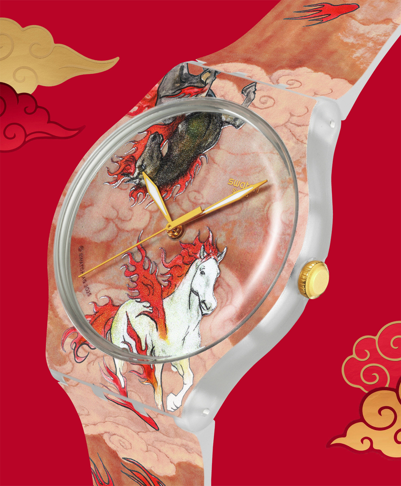 SWATCH 全新 Riding The Clouds 表款上共有黑白两匹骏马,一上一下、朝左右各自奔驰而去;骏马不仅散发炽热火焰,更象征阴阳太极、生生不息,而整体的绯红色调则象征从传统神话中得到灵感的辟邪护红色手绳;  41 毫米的面盘上以多色印花火焰与浮云成为骏马奔腾的背景,并搭配具夜光涂料的金色指针、雾面透明表环与表扣。