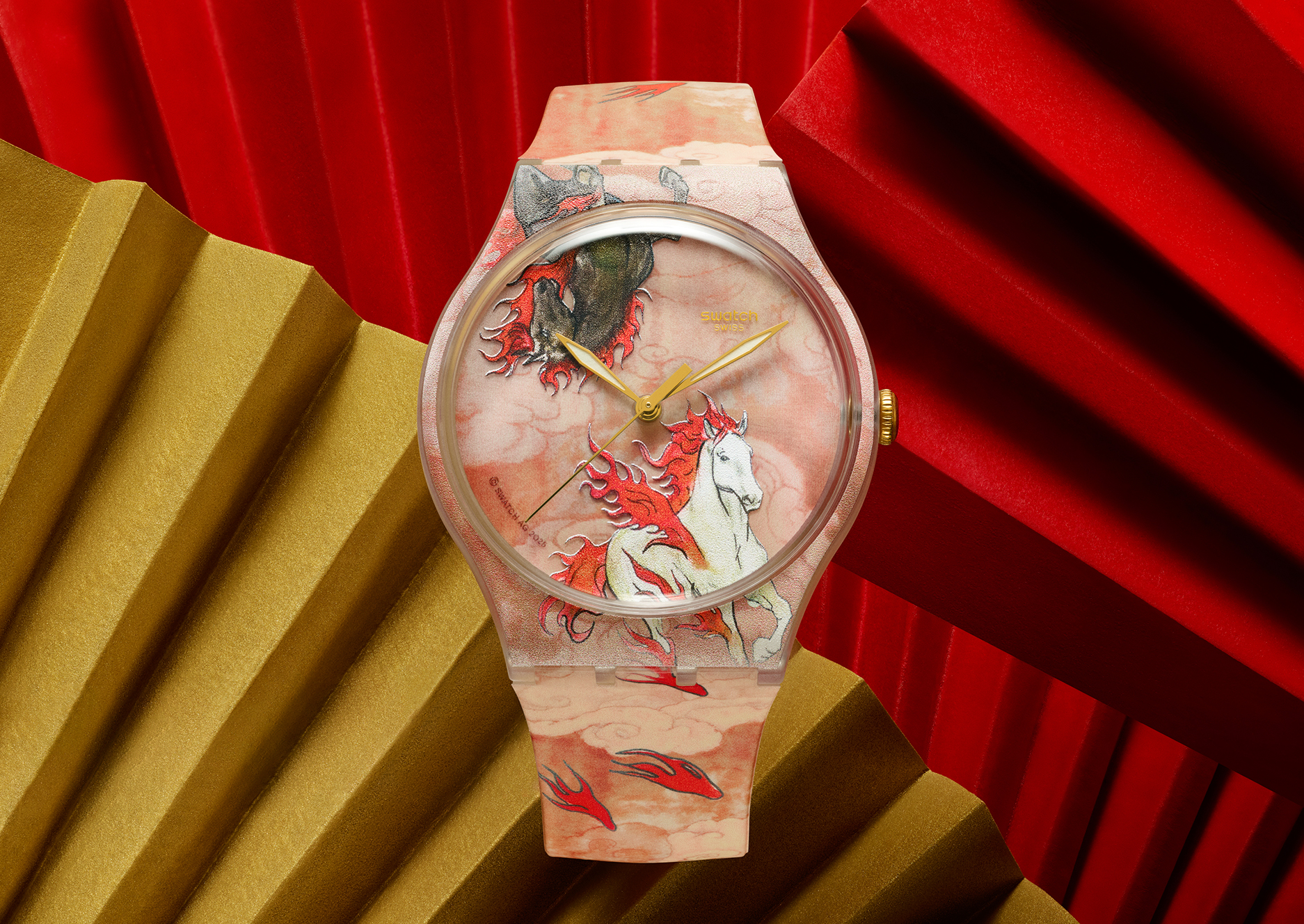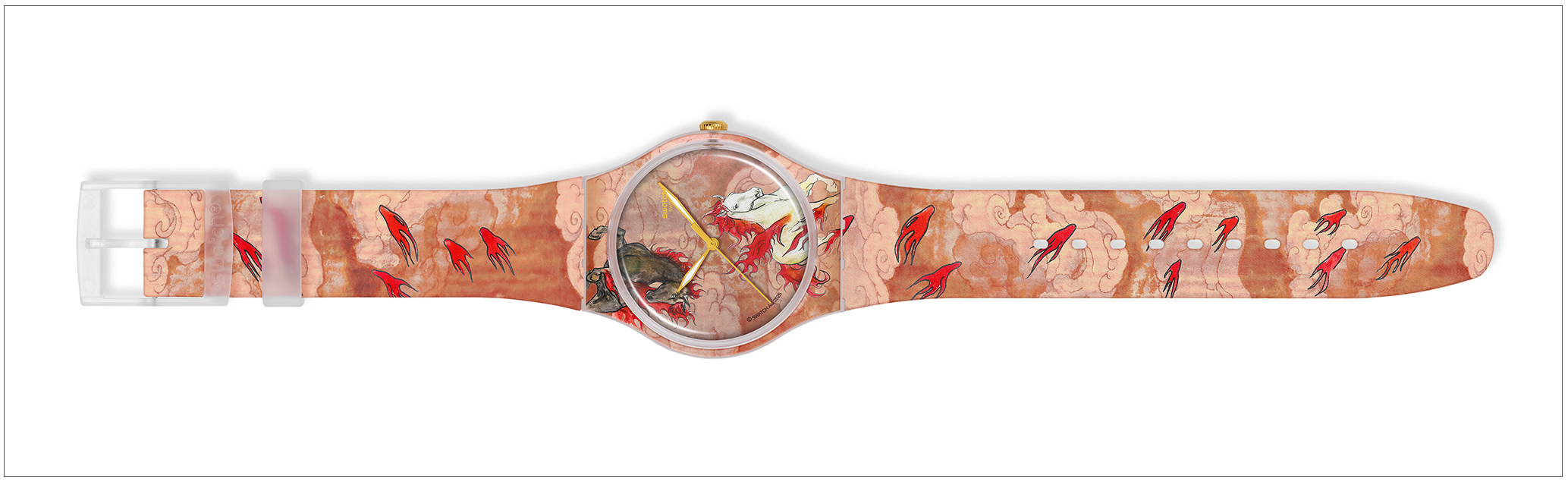 SWATCH 联手 Art Peace Hotel 驻村艺术家 #俞文杰 合作推出结合金红二色的 Riding The Clouds 表款庆祝马年来临。