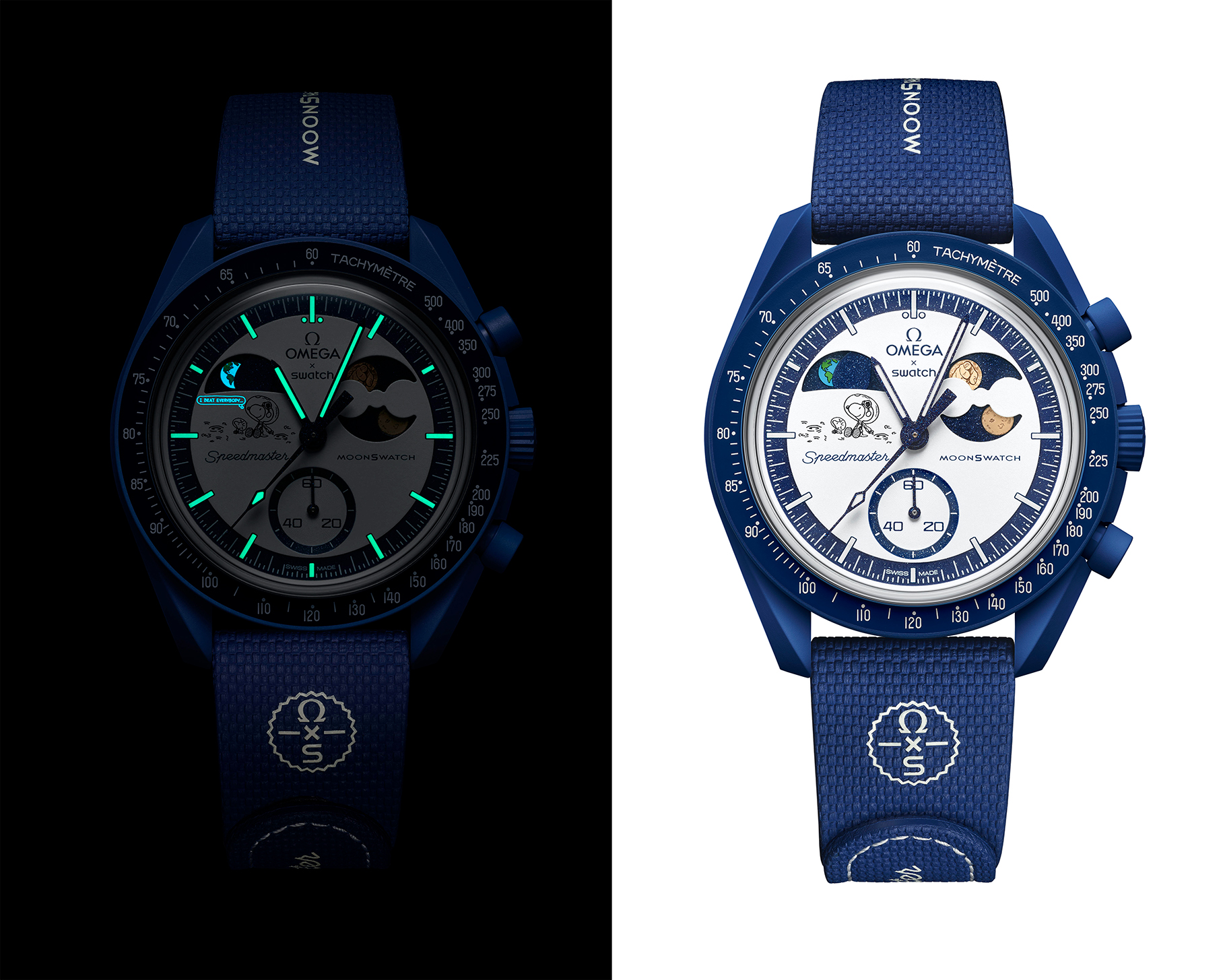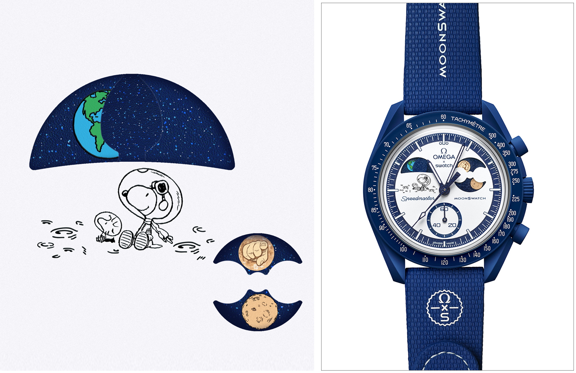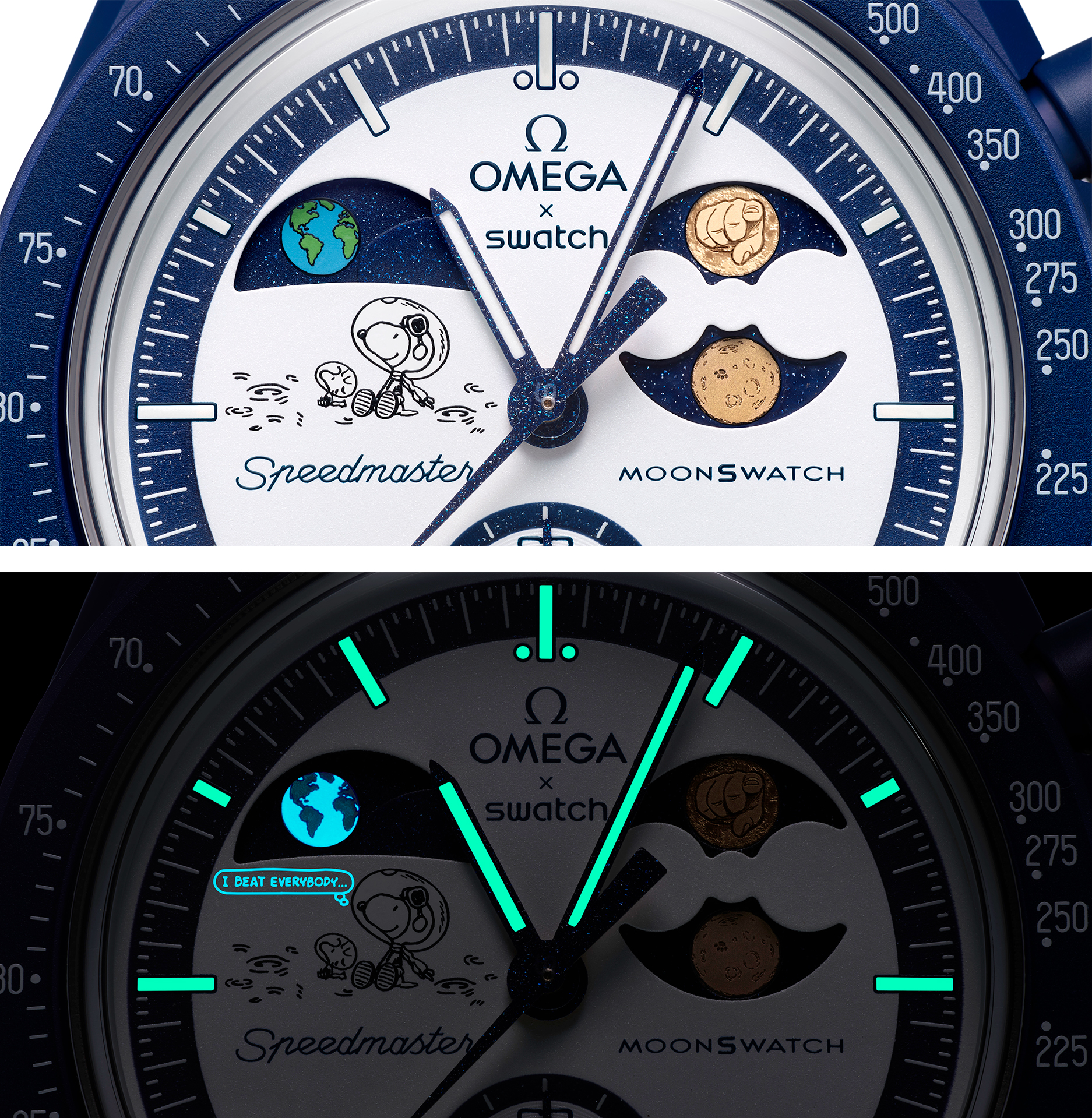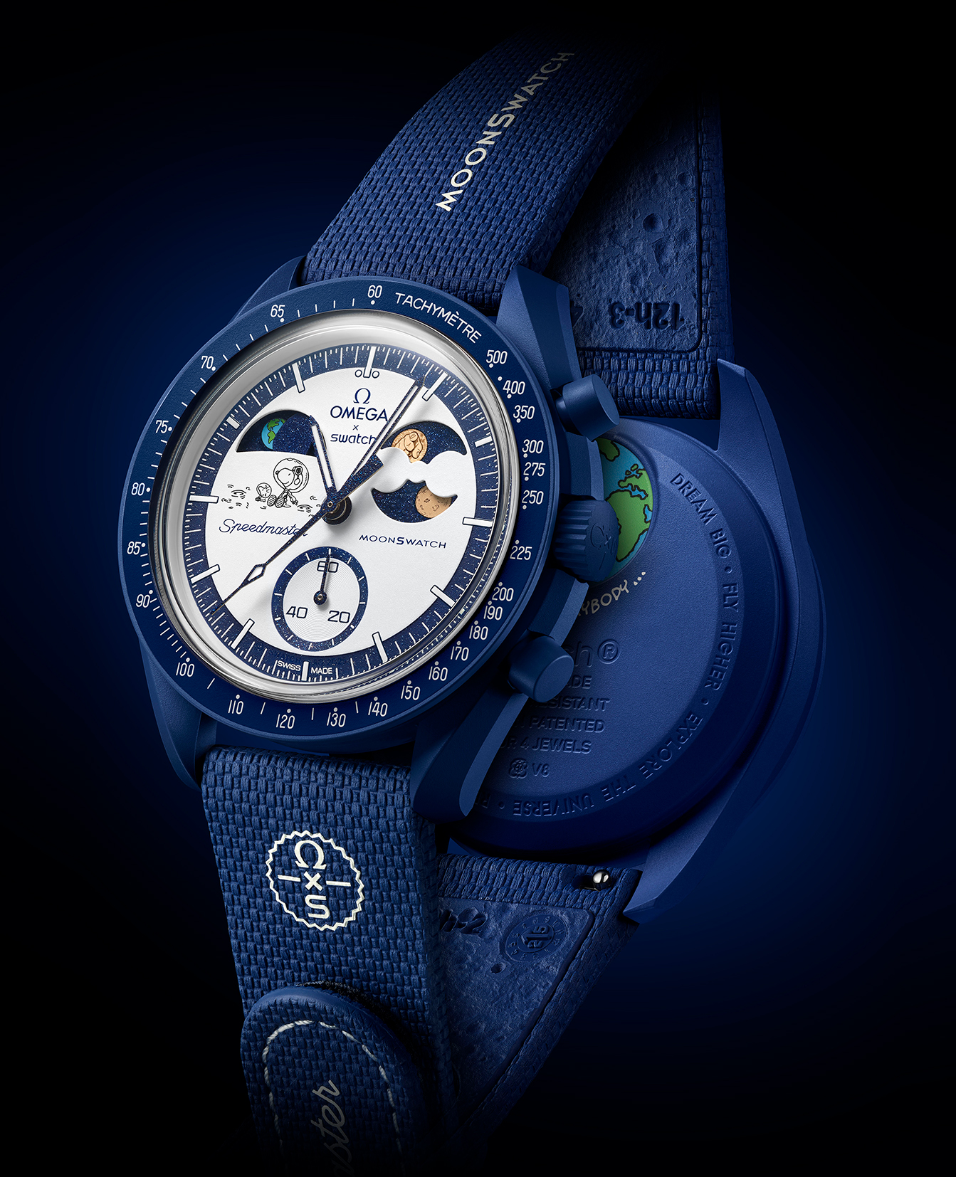本回 MISSION TO EARTHPHASE – MOONSHINE GOLD 全新手錶直径 42 毫米表盘, 并再次利用与以往作品相同的星空錶盘,月相显示器配备 OMEGA Moonshine™ Gold 作点缀,并饰以 Snoopy 世界的插画。如同 Bioceramic MoonSwatch 系列所有型号一样,这款 MISSION TO EARTH PHASE – MOONSHINE GOLD 亦利用 Swatch 专利的 Bioceramic 生物陶瓷所制,是一种混合陶瓷及由蓖麻油提取的生物来源 ( Biosourced ) 物料,并选用了独特的深海军蓝色调。