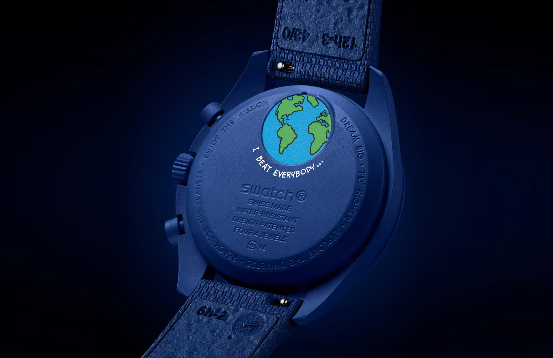 腕錶新作亦具备 OMEGA 经典 Speedmaster Moonwatch 的许多标志性特征,包括不对称錶壳和著名的「 Dot over 90 」錶圈测速仪。錶盘与錶冠上引有品牌标志,錶壳背面刻有其使命宣言「 I BEAT EVERYBODY 」。 电池盖设计灵感也注入卡通地球图案,同样地,海军蓝色 VELCRO® 錶带令作品增添传统太空时计魅力。