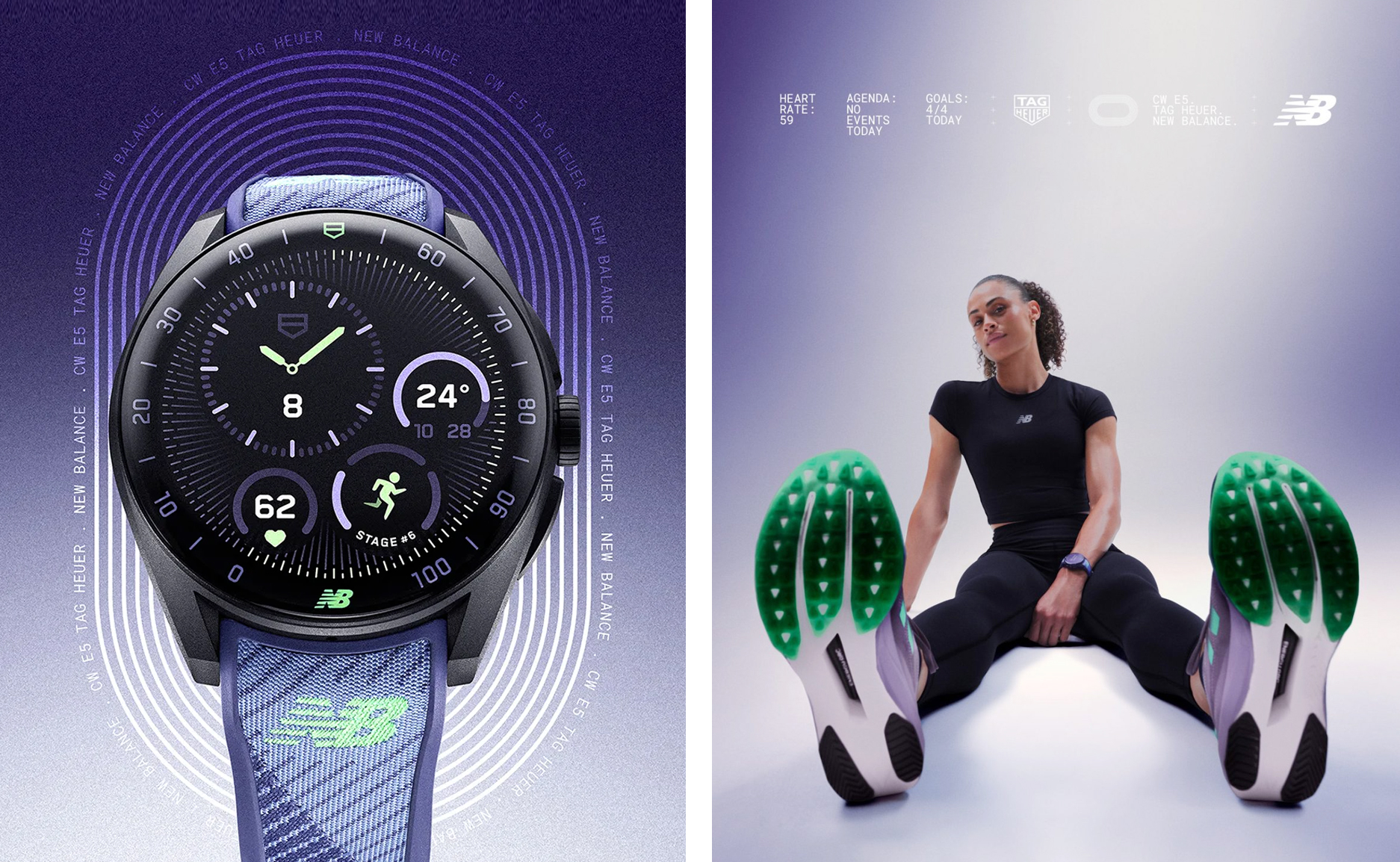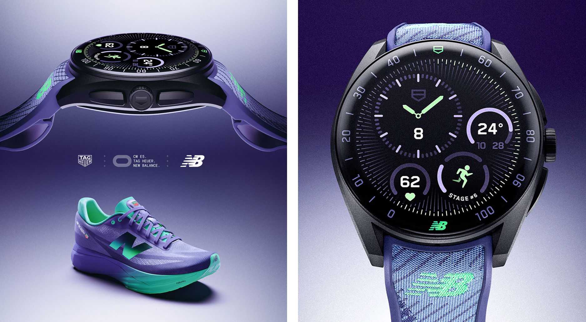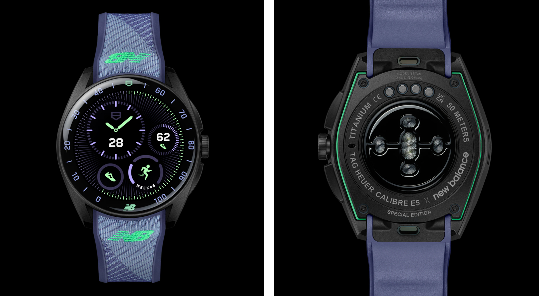 TAG Heuer Connected Calibre E5 智能腕錶 40 毫米 × New Balance 联名款,以黑色 DLC 处理 2 级钛金属打造,配色与联名跑鞋一样都是「 英式紫( English Purple ) 」,配备灵感源自 New Balance 鞋垫的专利缓冲舒适系统 Comfort Cushion System 及带有刺绣 New Balance 标志等两款錶带;錶款内建六套由 New Balance 独家训练计画,为初阶跑者到挑战马拉松等不同目标所设计。此设计结合具弹性的橡胶基底与源自跑鞋鞋垫的高科技纺织材质,兼具舒适度、耐用性与现代感外型。