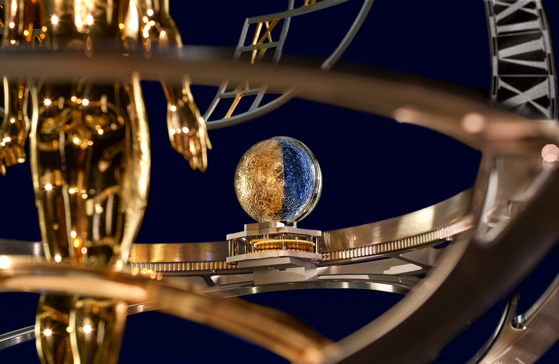 穹顶内还有一颗立体月亮,沿半圆轨道逆跳运转,其精准度高到 110 年不需调校,甚至内部另设独立发条盒来驱动这套逆跳系统,再加上随机排列的罗马数字小时与阿拉伯数字分钟刻度,每次人偶指示时间时,都展现不同的姿态,让观者始终保持新鲜感。