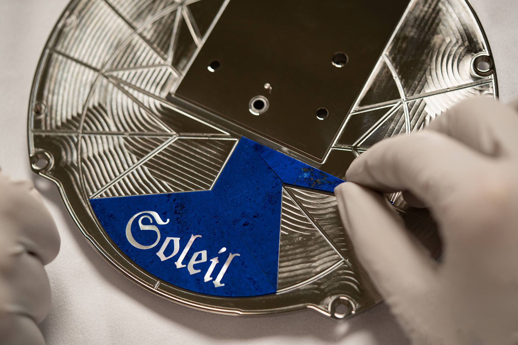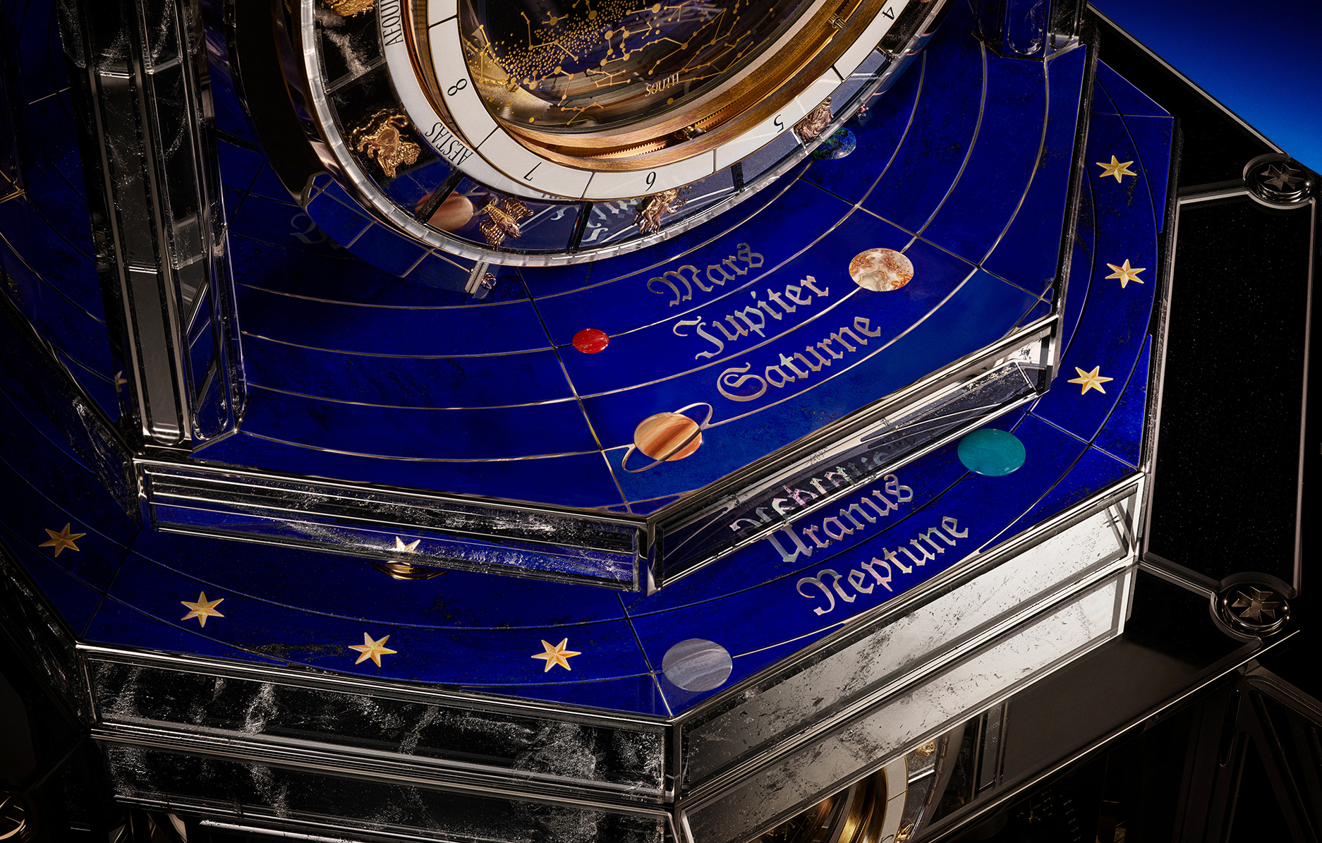中央天文钟是整件作品的心脏,搭载专为此作开发的 9270 手动上链机芯,拥有 15 日动力储存,由 5个发条盒驱动,正面设计宛如天体仪,以四层水晶盘营造立体层次感。 最吸睛的,是直径 28mm 的超大陀飞轮,它的外缘以及处于相对位置的日夜显示外缘合计共镶满 100 颗长阶梯形切割钻石,约重 11.6 克拉,华丽却不失机械感,陀飞轮上还加设放大镜,观者能细细欣赏每一个运转细节。