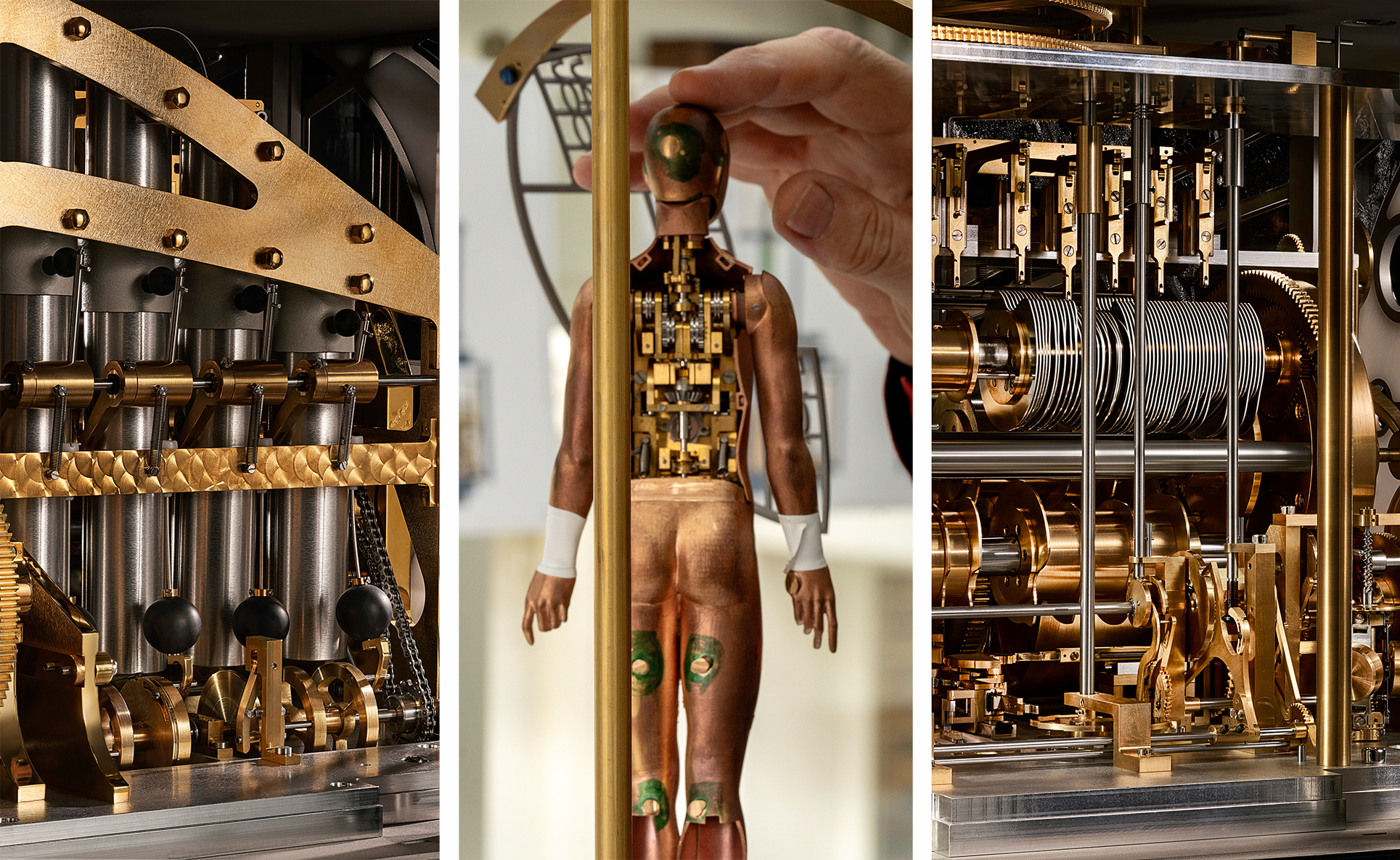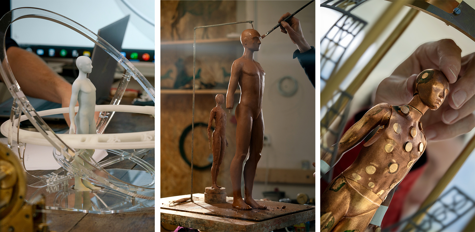 若说穹顶与天文钟承载著天文科学的精准,那基座就是情感与艺术的舞台,内部装置能驱动天文学家人偶展现 144 种姿态,靠的是 158 个凸轮组合而成的复杂系统。当人偶启动时,隐藏于基座的金属琴与哇音管会响起,由法国知名音乐 Woodkid 谱写的三首旋律随之流淌,每场演出长 1 分 30 秒,可以按需求启动,也能设置在 24 小时内自动上演,让这场「 时间剧场 」自动上演。