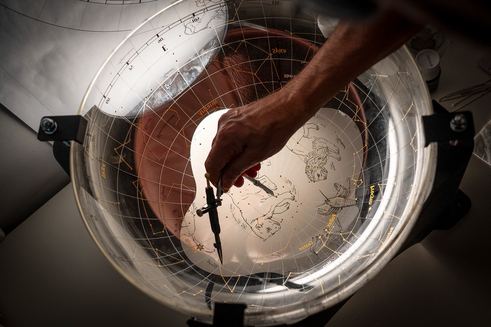 顶部玻璃穹顶上,靠著手工微绘出 1755 年 9 月 17 日 VACHERON CONSTANTIN 创立当日的日内瓦星空,这可不是浪漫点缀得想像,而是经过日内瓦天文台科学家严谨考证的成果,七大黄道星座与可辨识星体都忠实重现,彷彿将品牌诞生那一刻的天空定格于永恒。