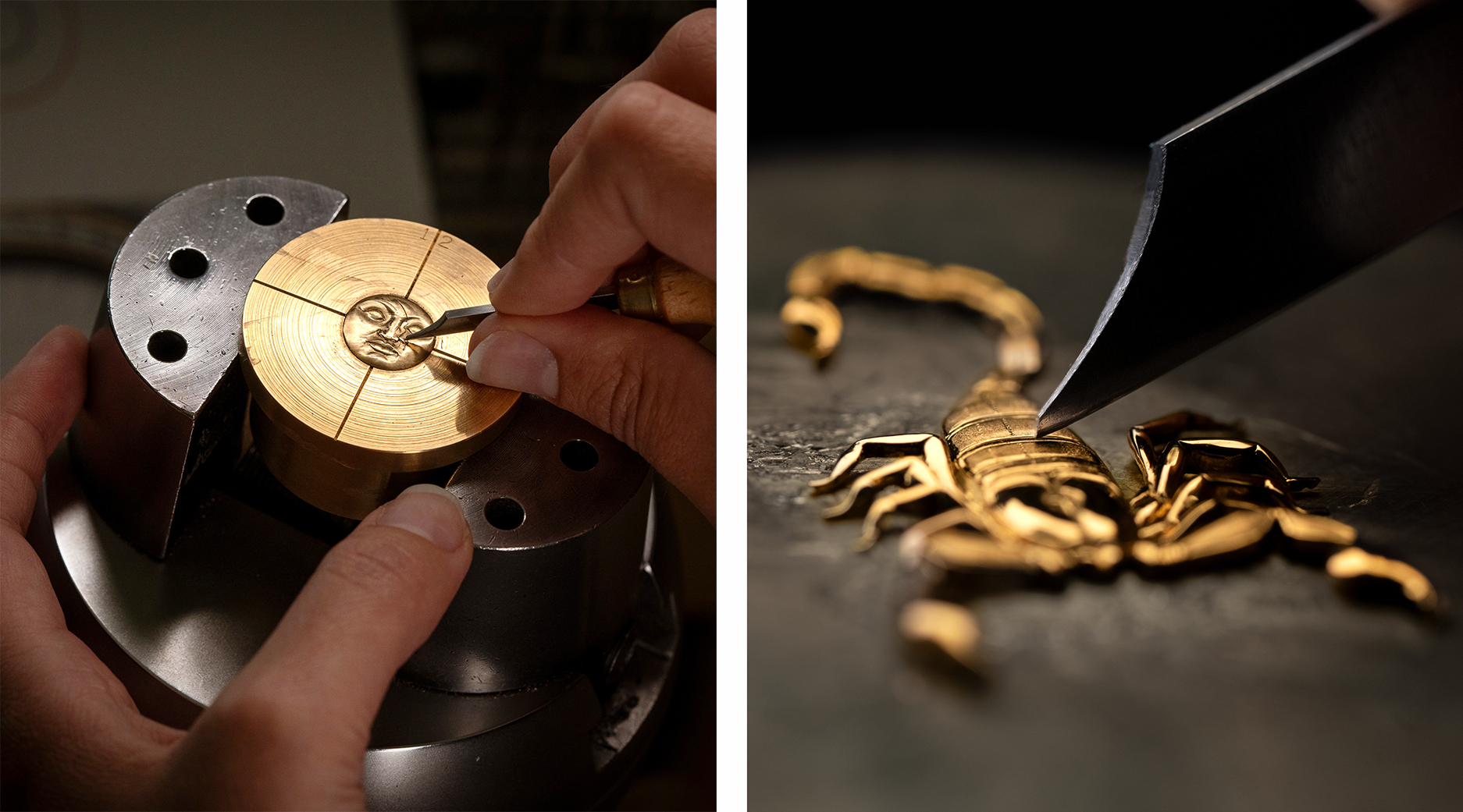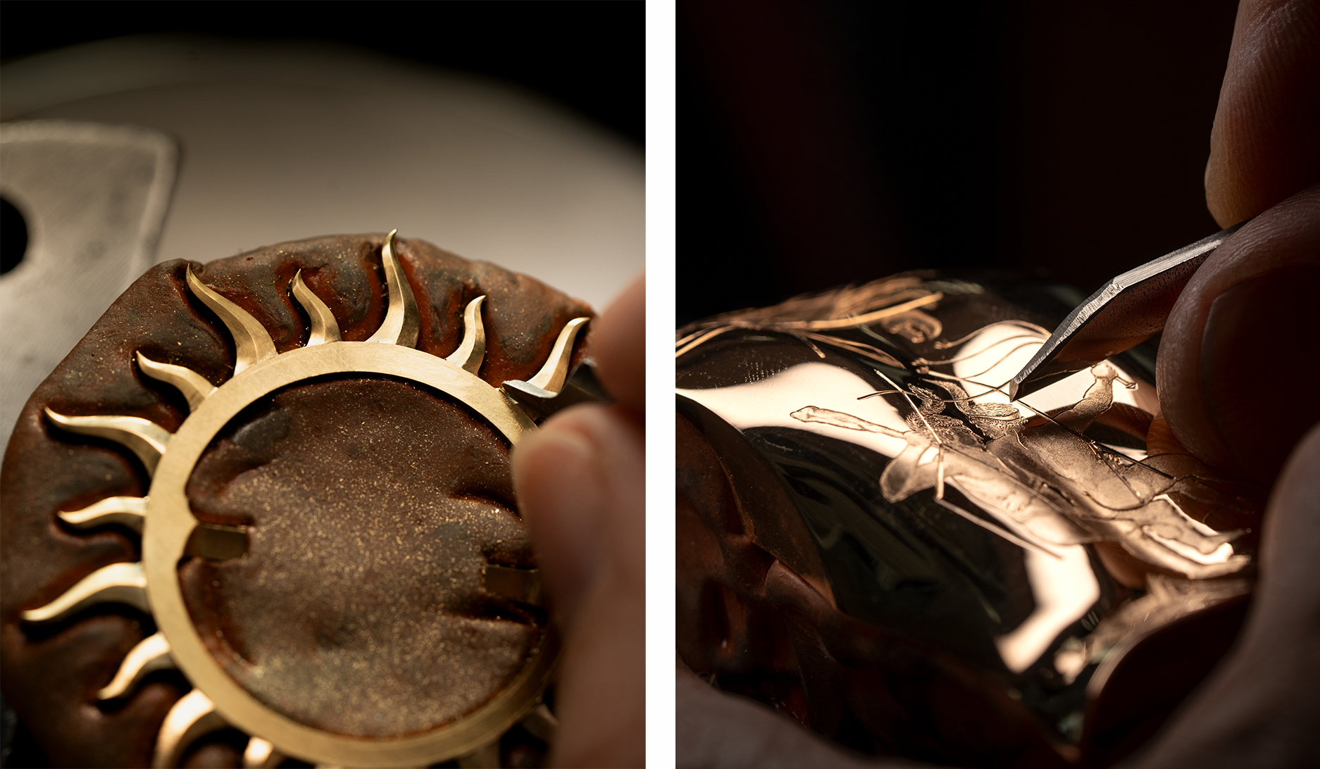 La Quête du Temps 座钟并非单一工坊的孤立创作,它是跨领域协作的缩影,VACHERON CONSTANTIN 携手机械人偶大师 François Junod、专业钟錶品牌 L’Épée 1839, 以及日内瓦天文台科学家,共同实现这座宏作。从珠宝镶嵌、珍珠贝母细工、水晶内嵌、珐琅彩绘,到青铜雕塑与玻璃微绘,每一种工艺都在这件作品中留下印记,天文学家人偶身上的 132 颗钻石,象征主要星辰,金色表面则由 18K 黄金镀层点缀,让科学与美学浑然合一。