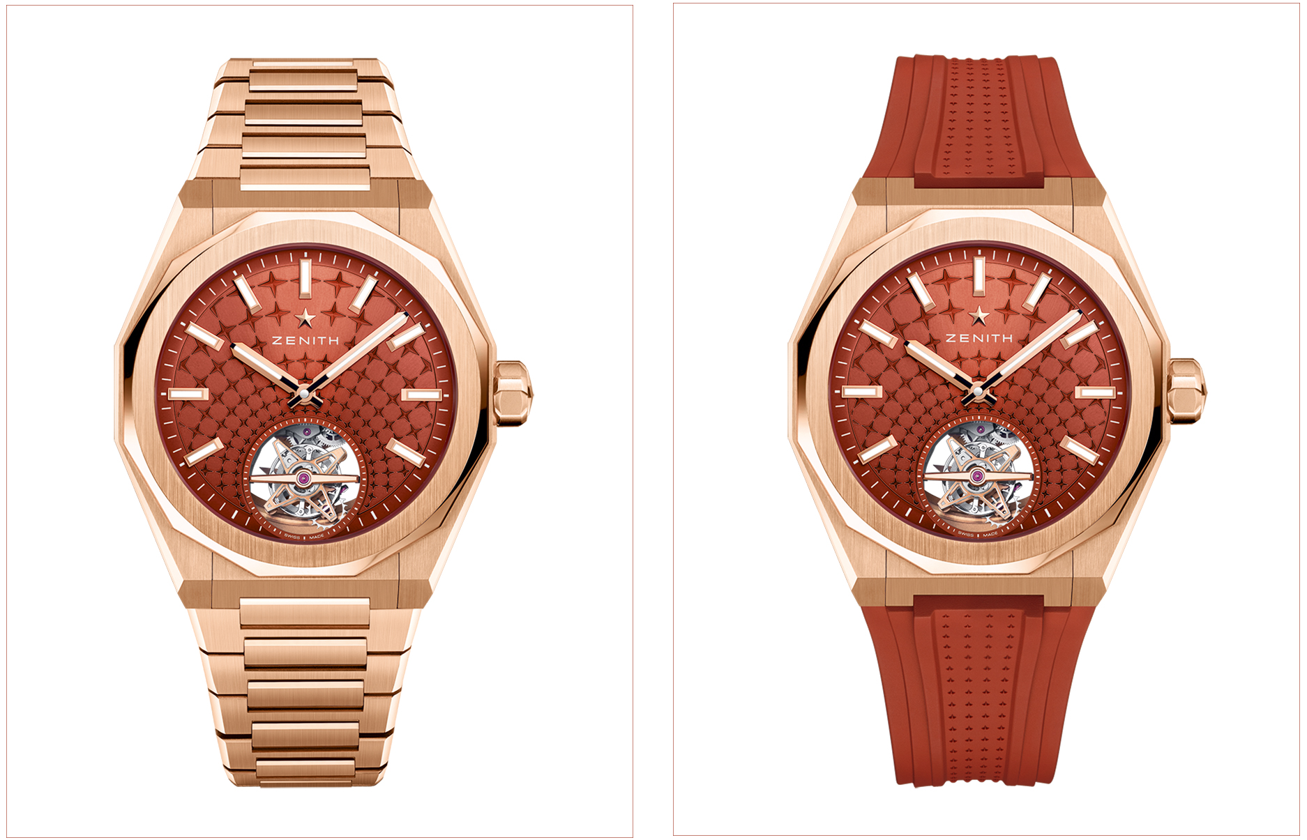 ZENITH DEFY Skyline Tourbillon 玫瑰金版不采用限量发行,象征它将成为系列常驻旗舰,它以全玫瑰金结构彰显奢华质感,以高震频陀飞轮体现技术自信,以红砖色面盘传递品牌传承, 对 ZENITH 而言,这只时计是一场设计与性能的协奏曲,证明品牌能在严谨机械语言中,赋予时间更具情感的温度。