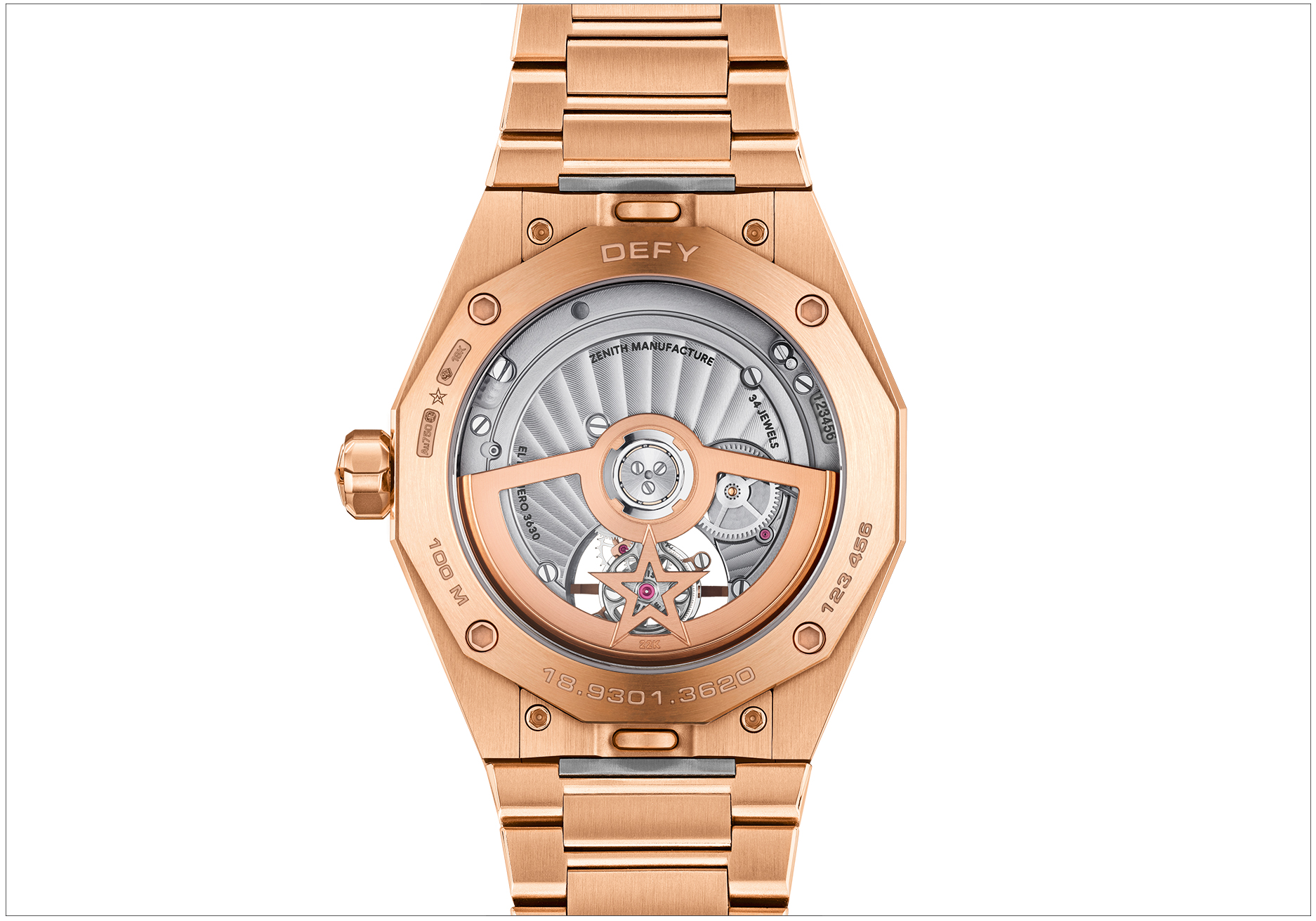 透过蓝宝石水晶底盖可见机芯装饰同样值得玩味,像是放射状的日内瓦波纹图案以雷射镌刻方式呈现,细节精准且充满现代气息,星形镂空自动盘以玫瑰金制作,既是功能部件, 也是设计风格的延伸,当自动盘缓缓旋转时,星芒闪烁之间流露出 ZENITH 经典符号的活力与自信。