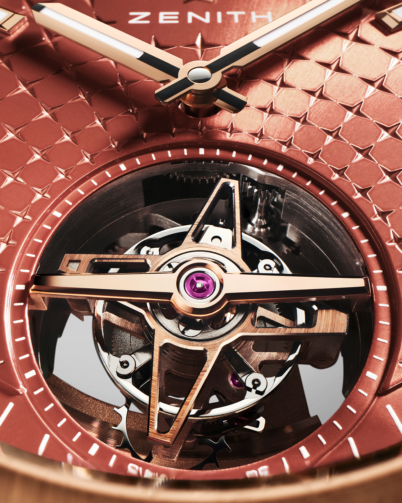 面盘部分同样有梗, ZENITH 以深邃的砖红色太阳纹作为基调,灵感来自品牌瑞士总厂的红砖外墙,这股温暖色调,与錶壳的玫瑰金相互映照,营造出独特的视觉韵律,面盘中央镌刻的四芒星图案向外放射,彷彿以六点钟位置的陀飞轮为宇宙中心,星光从此绽放。玫瑰金指针与立体时标均涂覆 Super-LumiNova 夜光涂层,即便在昏暗环境中仍清晰可辨,兼具美感与实用。