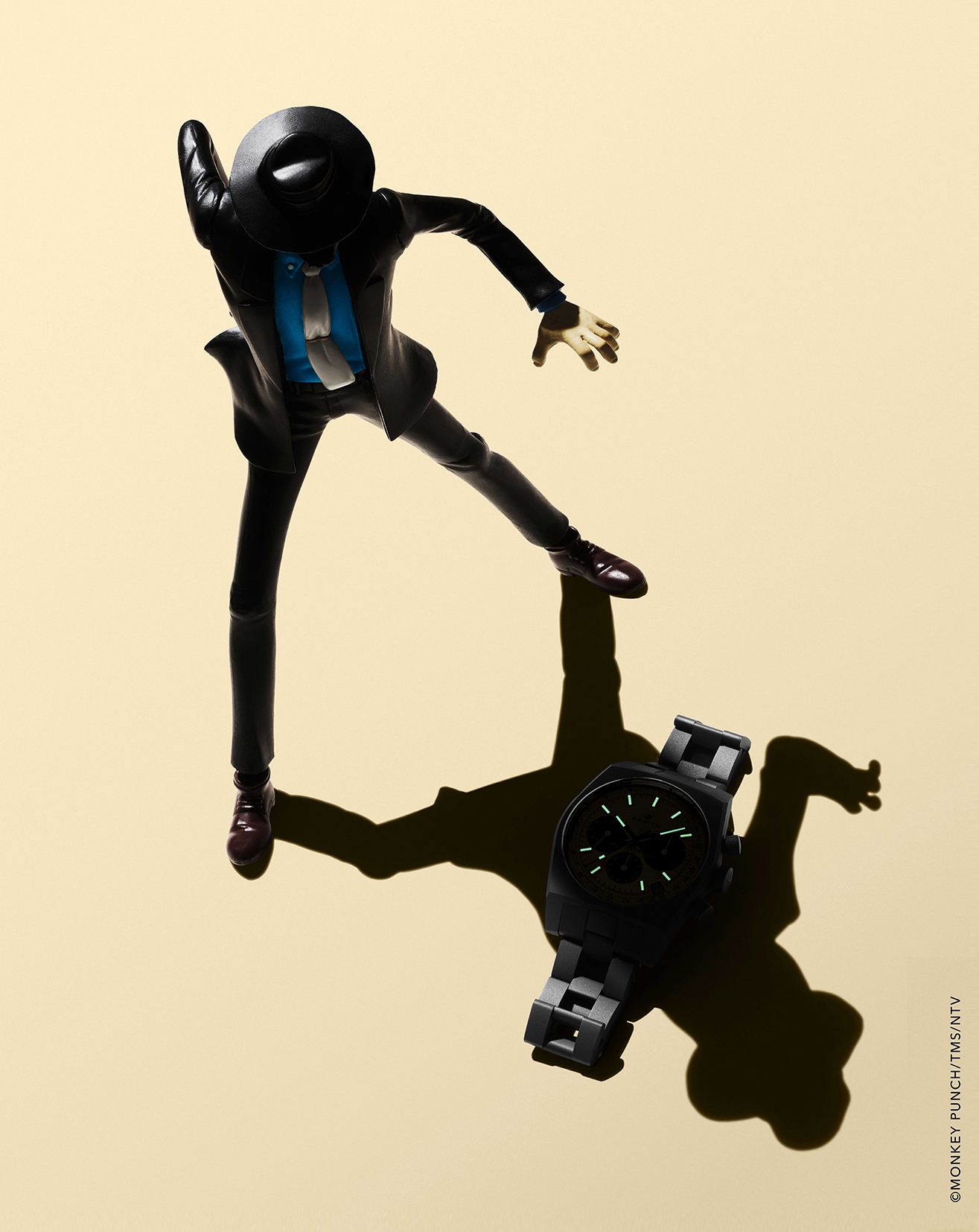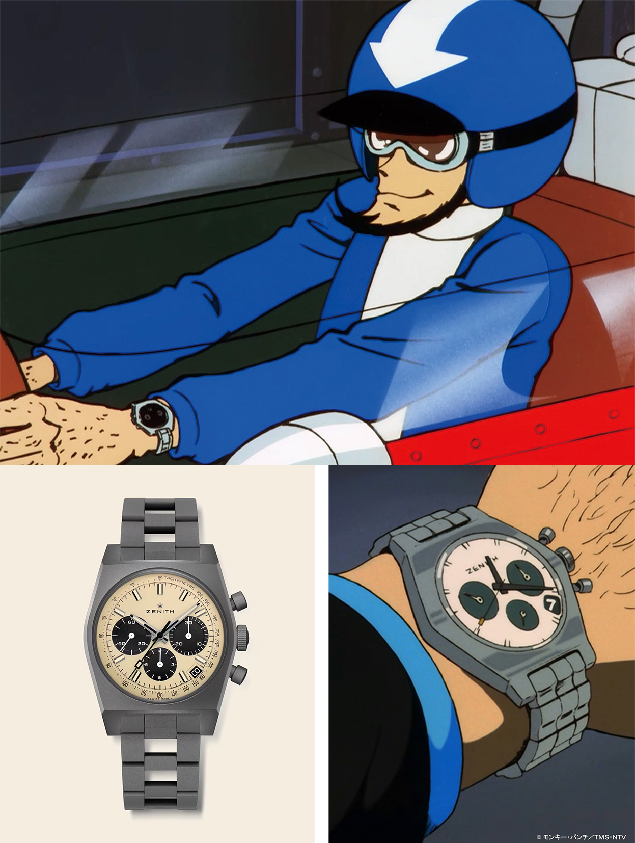 ZENITH 与日本知名动漫《 Lupin III 鲁邦三世 》 的连结可说是瑞士制錶界最有故事性的跨界合作之一,早在 1970 年代的动画里,鲁邦的忠实伙伴次元大介那只造型鲜明、带点神祕冷冽氛围的计时码錶便引起许多錶迷好奇,它的外型明显取材自 1969 年 ZENITH A384,但那款錶其实从未真实量产。 多年来,粉丝只看到它出现在动画里,却无法真正戴上手, 直到 2019 年, ZENITH 才开始将这段虚构历史带入现实,陆续推出黑面、熊猫面,以及混搭黑银不对称面盘的三款 “ Lupin the Third ” 联名錶,当时官方已经以三部曲作结,彷彿故事已经完整。