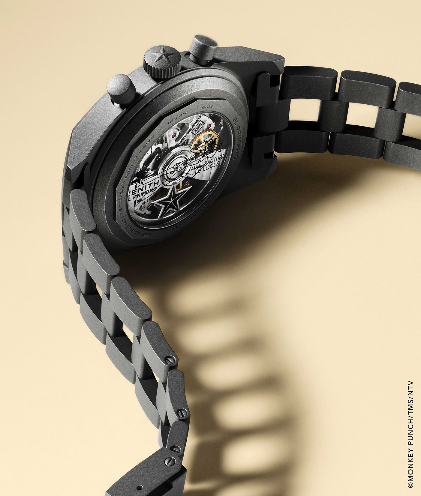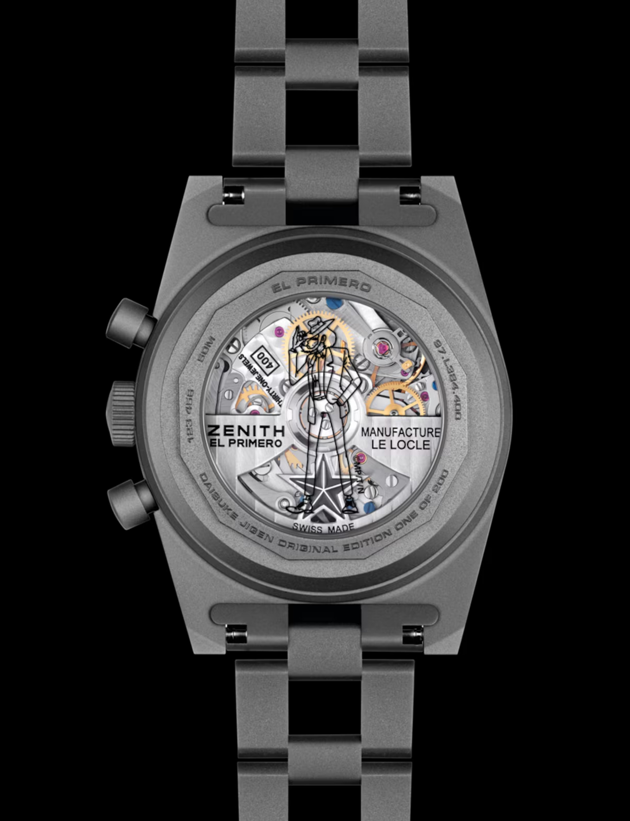 El Primero 400 这枚机芯是 1969 年初代 El Primero 的延续,采整合式导柱轮设计,高震频达5Hz, 能精准显示十分之一秒计时,动力储存为 50 小时,藉由透明底盖可以欣赏其结构与打磨细节,而底盖上镌刻的次元大介剪影,更是錶迷难以忽略的亮点,那个熟悉的侧影搭配帽沿线条,使整只錶的叙事性完整许多。